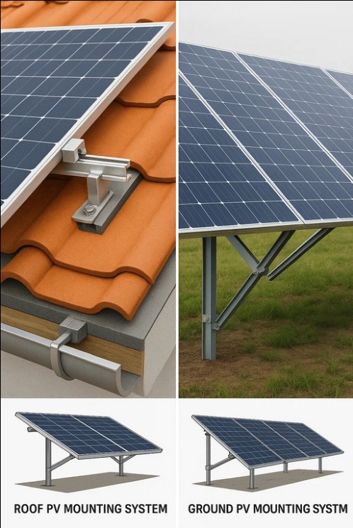 Katon PV-asennusjärjestelmät asennetaan suoraan asuin-, liike- tai teollisuusrakennusten katoille. He käyttävät olemassa olevia rakennusrakenteita tukemaan aurinkopaneeleja. Asennus voi vaihdella kattotyypistä riippuen, kuten tasakatot tai kaltevat katot, ja se vaatii usein räätälöityjä asennuskiinnikkeitä varmistaakseen turvallisen integroinnin rakennukseen. Sitä vastoin maadoitettu PV-asennusjärjestelmä asennetaan avoimelle maalle. Niiden tukirakenteet ovat yleensä säädettävissä, minkä ansiosta kehittäjät voivat optimoida paneelien suunnan ja kallistuskulman maksimaalisen aurinkoenergian talteenoton saavuttamiseksi. Kattoasennuksiin verrattuna maahan asennetuissa järjestelmissä on yleensä vähemmän rajoituksia tilan ja suunnittelun joustavuuden suhteen, mutta ne edellyttävät maan saatavuutta.