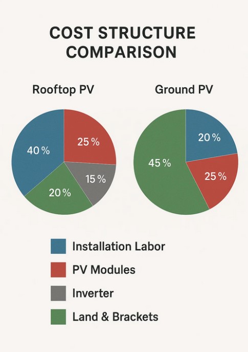 Kustannukset ovat tärkeä tekijä verrattaessa näitä kahta järjestelmää. Katon aurinkosähköjärjestelmillä on yleensä alhaisemmat maankäyttökustannukset, koska ne hyödyntävät olemassa olevia rakennusrakenteita. Asennuksen monimutkaisuus voi kuitenkin lisätä kustannuksia, jos katot ovat muodoltaan epäsäännöllisiä tai vaativat vahvistusta. Maasähköjärjestelmillä on yleensä korkeammat alkukustannukset maan valmistelusta, perustusten rakentamisesta ja tukirakenteista johtuen. Siitä huolimatta maajärjestelmät tarjoavat usein mittakaavaetuja, mikä tekee niistä kustannustehokkaita suurissa projekteissa. Kokonaisinvestointipäätös riippuu käytettävissä olevista maavaroista, odotetusta energiantuotannosta ja sijoitetun pääoman pitkän aikavälin tuotosta.